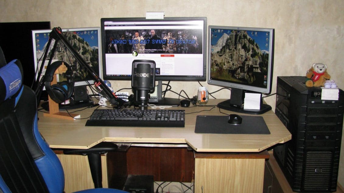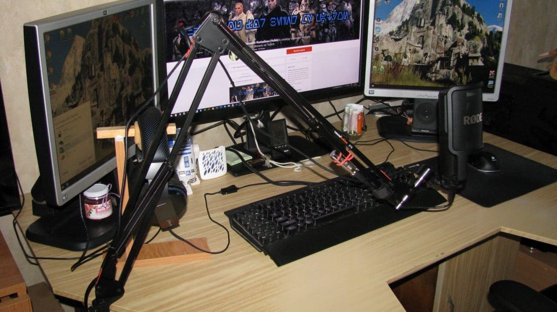 On this one you can more clearly see the home-made custom wooden Custom Headphone Stand (the link leads to my guide of how to make it). I am not ashamed to show it as it may look a bit ugly, but… well… nobody would see it during live streams and it saved me a lot of money by not having to buy one. I had similar intentions originally about the Boom Arm for the Microphone at first, but gave way to the pro and real stuff, because if I did buy a Desk Lamp and adapted it for a Mic stand, it would have started fading and failing in a week time or possibly even sooner. You know what I mean, those cheap crappy Desk Lamps from Ikea… for example. BTW, in one of the pictures above you might notice the PC sits on something. That “stand” is also custom home-made. :)