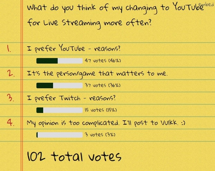 Unlike many frustrated streamers, who were fighting for their spot under the sun (in our case it’s a spot on Twitch), I never strived for that. It came on its own, slowly, and made me realize that I have it and need to start acting accordingly. I made a note also during the article that I don’t care for numbers of views. That, of course, is not to say I don’t want viewers. Live streaming is nothing without the great company of like-minded players who enjoy the same game and gameplay I show. Currently I get probably half of the views per live show than what I get from Twitch. However, YouTube is my main video source and activity. Always has been. I made my Social accounts to support it and just like it happened with my Twitch account – I realized posting links and advertising my own creations is nothing without the communications with followers. I created a Twitch account not to replace YouTube, but because at the time Google didn’t have a decent product to go Live with. Having to download an archived stream from Twitch, edit, render, re-upload to YouTube, wait for it to process until I can finally publish the video, has always been a strain I struggled a lot with. If I can do it in the same place and with the same audience, what better can I ask for?