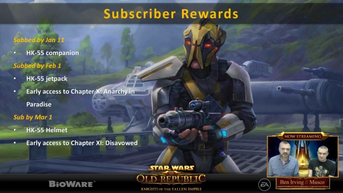 All Subs who opt in for email notificatoins by February 14th will receive a code by Bioware for 1050 Cartel Coins as a reward. Also they will share a FREE code to give to a friend for full access to Fallen Empire Chapter.