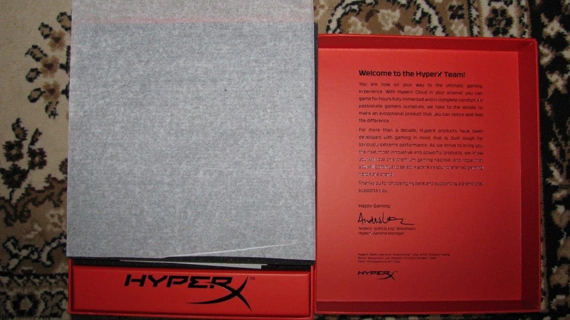 HyperX have the reputation of making outstanding packaging. This headset does not make an exception. The box is incredibly well designed. In the inside of the top cover there’s a printed letter, the contents of the box are nested comfortably in very thick (but very smooth) black dyed foam. This thing can easily fly and travel through the whole world without any danger of damage to the items inside it.