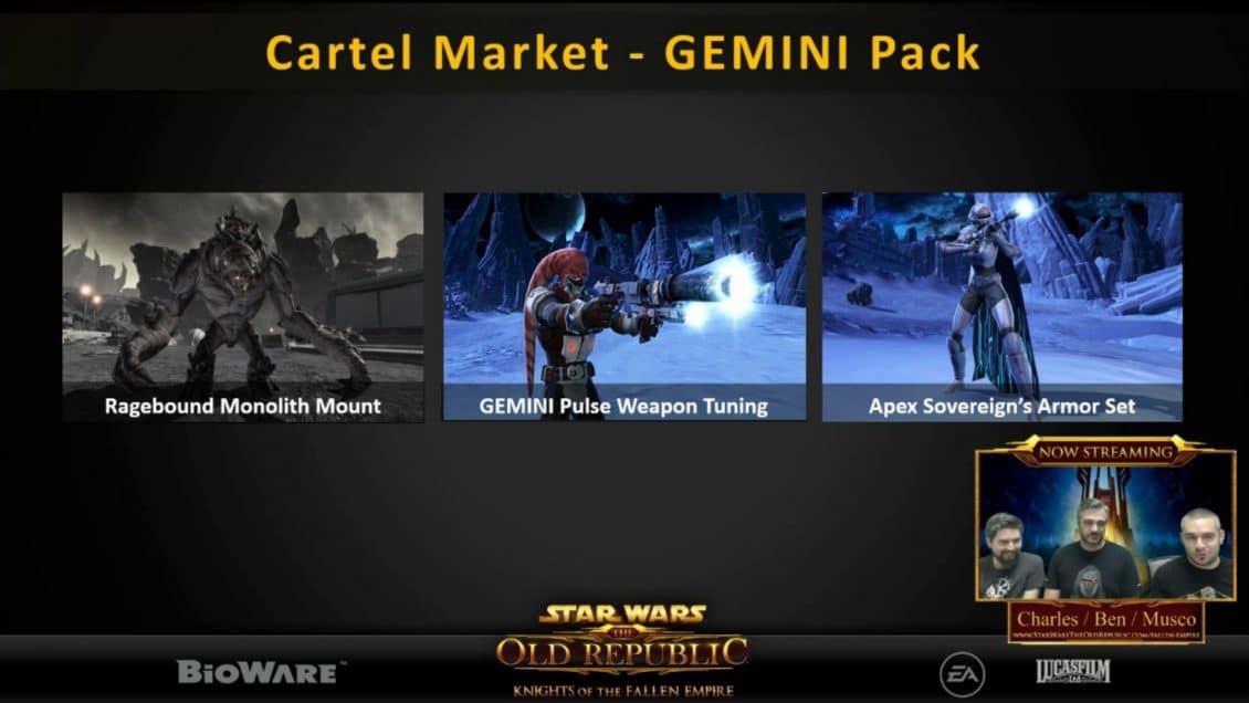 The usual giveaway during the event was for the viewers to vote which of the 3 items from the latest GEMINI cartel packs was the best looking and greatest overall… Check the picture attached to the right for a preview of the 3 items. Unfortunately, while the raffle was going on, the 3 guys wasted ~5-6 minutes giggling and talking nonsese :)