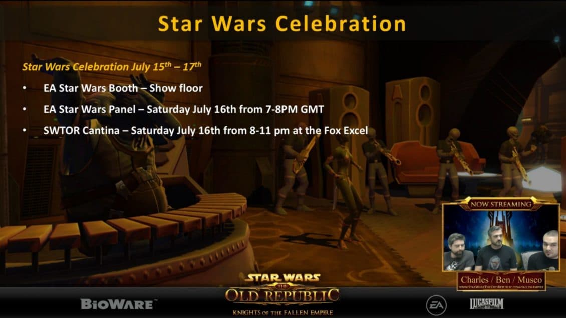 - The SWTOR Cantine will be on 16th July from 8 to 11 pm at the Fox Excel, which is right outside the Celebration area and does not require you to have a pass to be there. From what I could get – the EA panel will likely only briefly mention SWTOR and the real event will be… outside Celebration, in a nearby building (like last year).