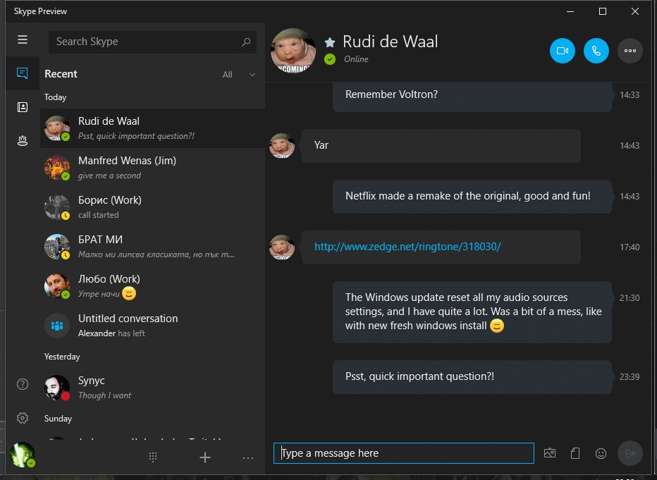 Well, I have to mention this. The new Skype is cool! It’s sleek, it’s shiny, it’s dark (well, could be, if you wanted it to) and it’s quicker and faster. I absolutely advice you all to take a look. The new Skype App uses Microsoft’s cloud and isn’t based on P2P any more. This helps improve the speed of the service a lot. There are far too few settings for the moment, but I am sure Microsoft will be improving it in the future. The fact that this app is several times lighter and faster than the old standard Skype for Windows, is enough of advertisement to give it a go.