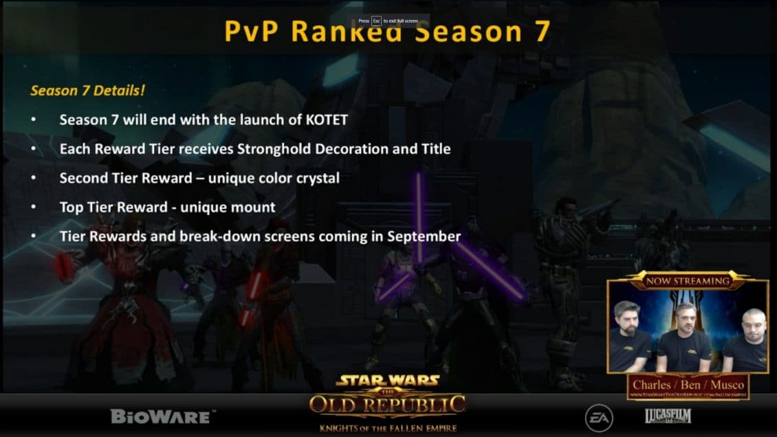 Season 7 will end with the launch of the new expansion KOTET. Bioware is very secretive STILL about launch date and any other details about KOTET. However, rumour is that it will arrive in the end of October or November.
