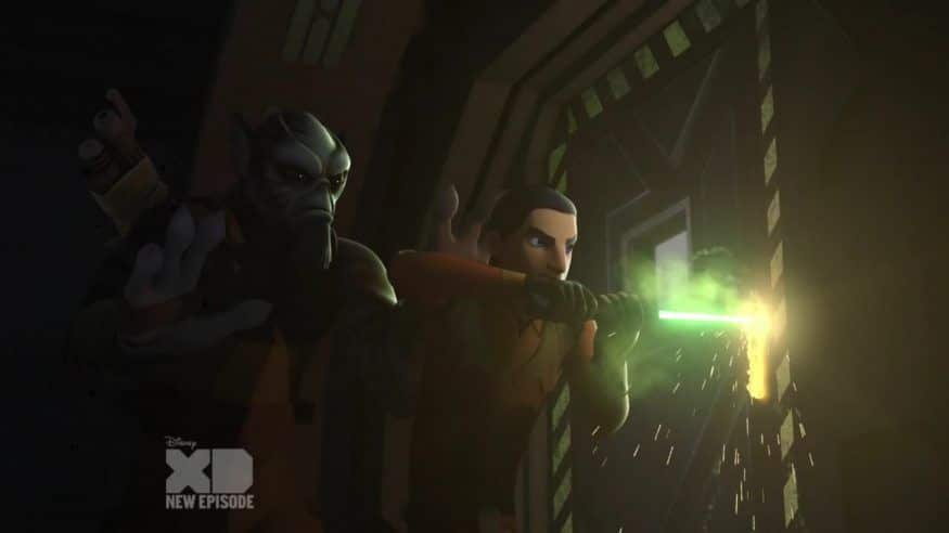 One of the best moments of the season and probably of all 3 seasons so far. I’m talking about the spot in the episode, where the boarding party sits at a closed door. Zeb asks Chopper to help and unlock it, but Ezra just takes out his lightsaber and cuts a hole in the door. The fun part is that in the very same moment Ezra is finished cutting it, Chopper opens the door. As it was explained in the Rebels Recon episode on StarWars.com this wasn’t originally part of the script. The door was supposed to be full and later on used to block the way for the sentry droids chasing Zeb, Ezra and the others. However, with a hole in it, things get more funny.