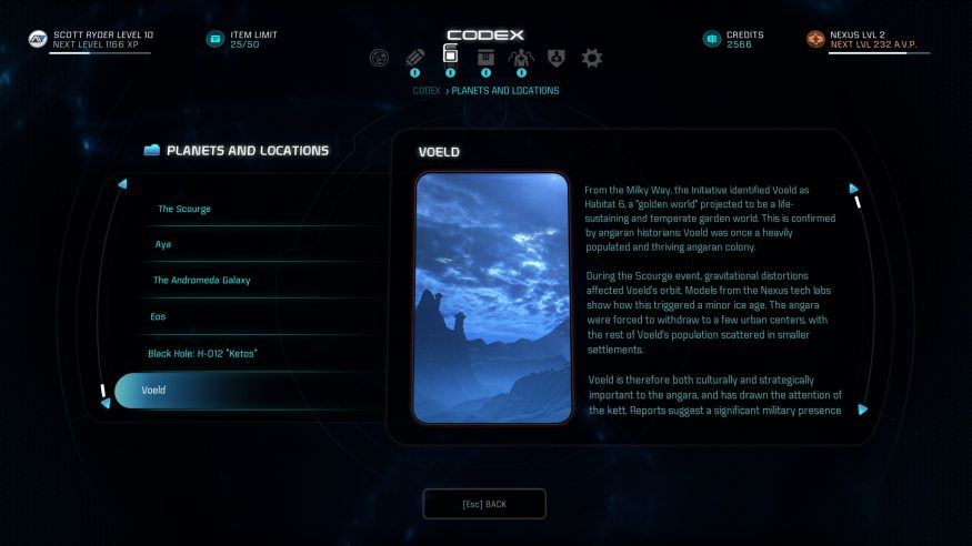 As you make your progress through Andromeda, new worlds and destinations will be revealed before you. Many of them will be deadly and unfriendly, so be prepared, pick your loadout before you land on a new planet. Use every hint and suggestion given during mission cutscenes or via Lore Updates in the Codex.