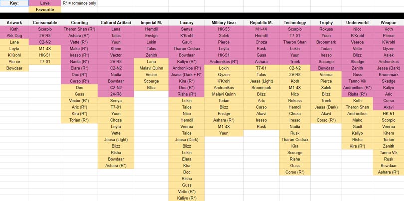 Below is a list of what your companions would LOVE and FAVORITE to have as a gift from you.