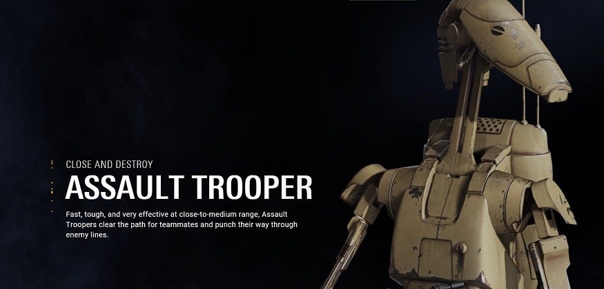 Fast, tough, and very effective at close-to-medium range, Assault Troopers clear the path for teammates and punch their way through enemy lines. Assault Troopers move quickly and excel at overcoming defenders and taking positions. Each trooper class can equip Star Cards to modify and enhance their combat abilities.