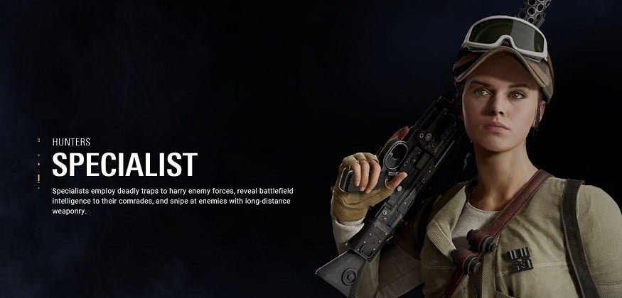 Specialists employ deadly traps to harry enemy forces, reveal battlefield intelligence to their comrades, and snipe at enemies with long-distance weaponry. Striking from hiding, specialists rely on stealth and position to finish foes before they ever see a threat coming. Each trooper class can equip Star Cards to modify and enhance their combat abilities.