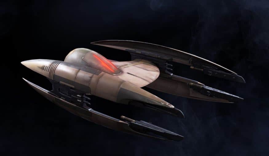The Scimitar, also known as the Sith Infiltrator, was a heavily modified Star Courier and the personal starship of Darth Maul. After his defeat during the Battle of Naboo, the experimental starfighter was appropriated by Maul’s master, Darth Sidious. The Sith Infiltrator featured folding wings around its circular cockpit, and was secretly modified from a Star Courier manufactured by Republic Sienar Systems. The craft featured six laser cannons, a proton torpedo launcher and a minelayer. Along with its deadly armament, the Scimitar was equipped with a cloaking device that allowed it to disappear from view and any pursuing ship’s sensors. Owing to the craft’s experimental ion engines, radiator fins on the ship’s wings were required to be open during flight in order to expel excess heat.