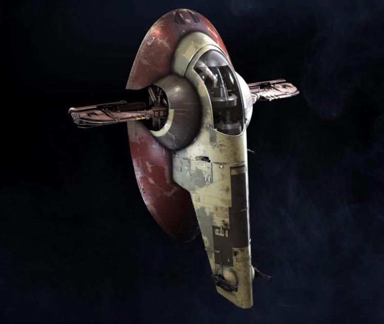 Slave I was a modified Firespray-31-class patrol and attack craft used by the infamous bounty hunter Jango Fett before the Clone Wars. Jango outfitted the craft with a number of weapons, including laser cannons, projectile launchers, and seismic charges. While under Jango’s ownership, the ship was in a dogfight over Geonosis with the Jedi starfighter piloted by Obi-Wan Kenobi. After Jango’s death during the Battle of Geonosis, the craft came into the possession of his son, Boba Fett, who used it throughout his own bounty hunting career.
