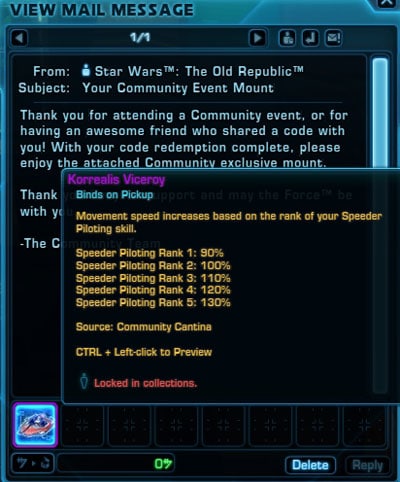 After you redeem it, you will receive an email InGame. If you have SWTOR running, you have to restart it for the item to appear in your mailbox. This speeder will be available to all of your current and future characters for free.