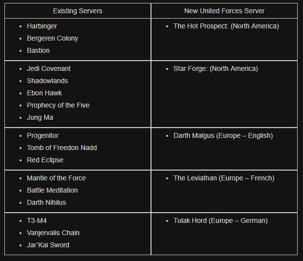 It is our intent that this process will have very little impact on you or your account. Since Character names must be unique on a server, it is possible that when we create the new United Forces servers, you may need to rename your character. As part of the process of uniting the galaxy, we will communicate a specific set of rules to govern the prospective scenario where two names collide: