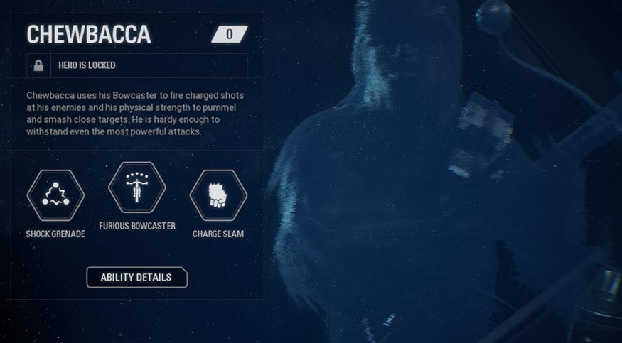 Chewbacca uses his Bowcaster to fire charged shots at his enemies and his physical strength to pummel and smash close targets. He is hardy enough to withstand even the most powerful attacks.