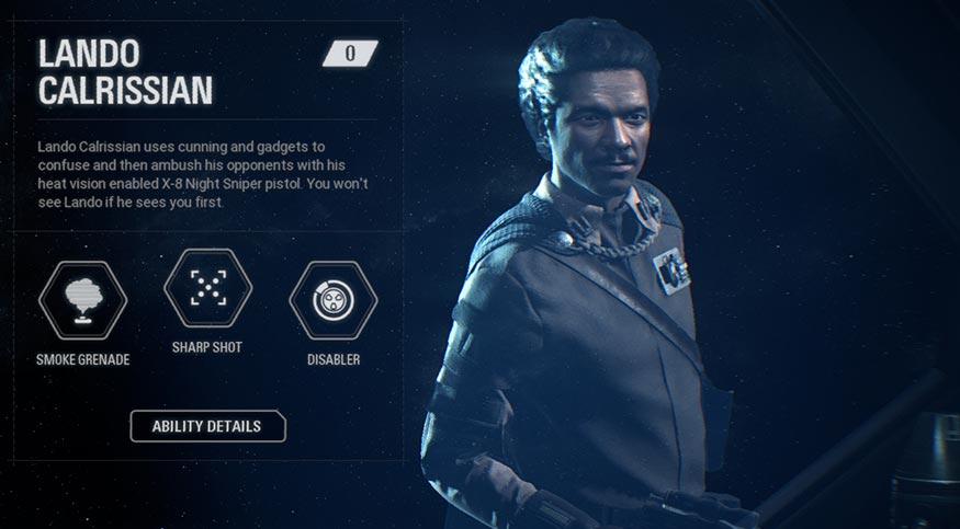 - Disabler: Lando uses a thrown device to disrupt enemy radars, scout an area, and can detonate the device to send a shock through nearby foes.