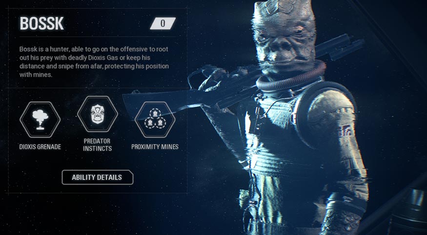 Bossk is a hunter, able to go on the offensive to root out his prey with deadly Dioxis Gas or keep his distance and snipe from afar, protecting his position with mines.