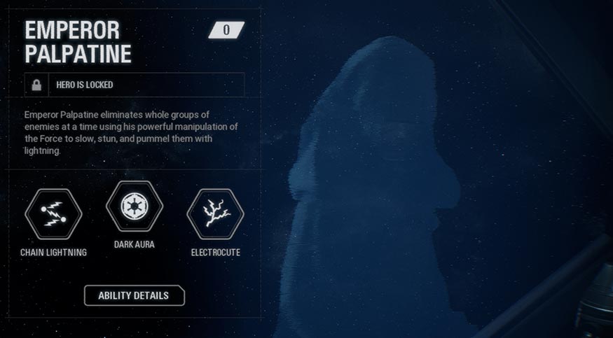 - Electrocute: Palpatine immobilizes enemies in front of him with electrical energy.