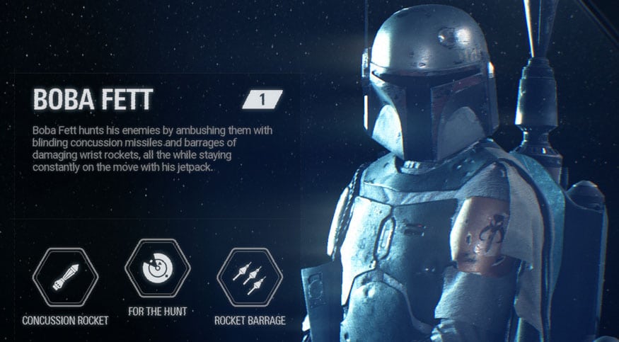 - For the Hunt – enemies around are revealed for a short period of time during which Boba Fett dissapears from enemy radars and can utilize unlimited Jetpack fuel