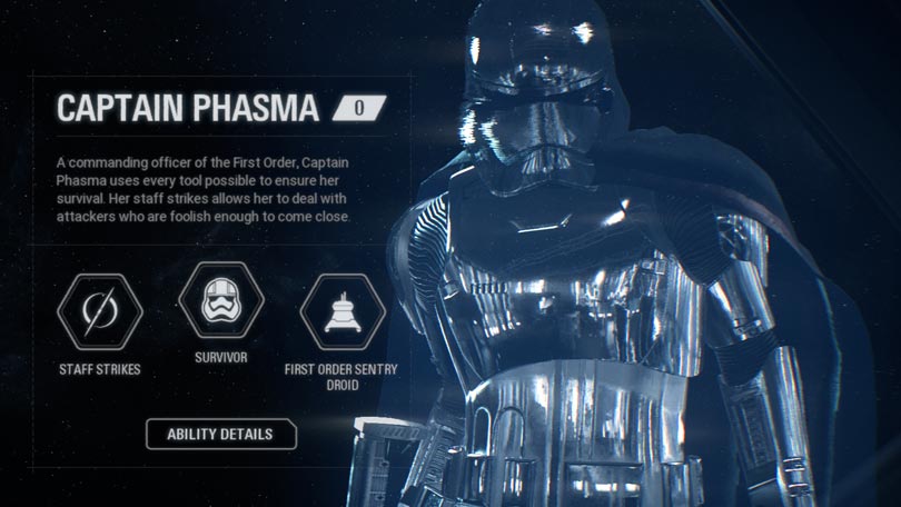 Phasma is a high-ranking Captain of the First Order, though her actual ranking is higher than her title suggests. She trains and commands the First Order’s stormtrooper soldiers. Phasma is one of the two new Battlefront II DLC characters that will be made available for free after the game launches.