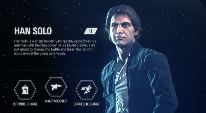 Han Solo is a sharpshooter which quickly dispatches his enemies with the high power of his DL-44 blaster. He’s not afraid to charge into battle and finish the job with explosives if the going gets tough.