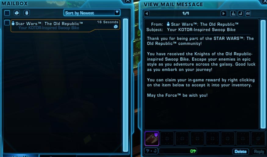 - Visit www.swtor.com/redeem-code and enter “KOTORSPEEDER”.