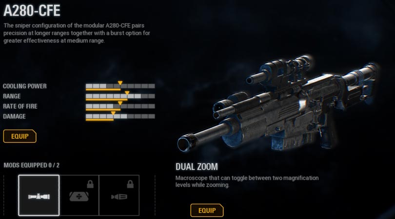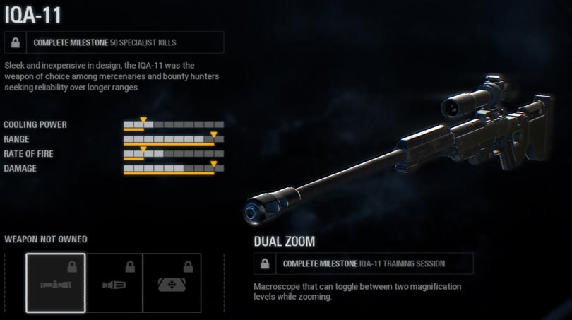 Sleek and inexpensive, the IQA-11 will be yours after you score 50 kills on the battlefront. The weapon relies on range and damage, but it lacks in the rate of fire department. Available mods: