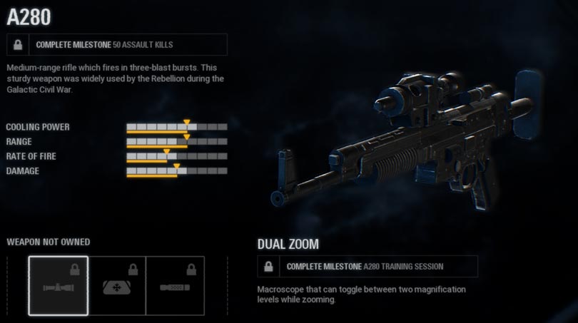A standard issue blaster rifle with reliable range and damage output. This is the stock weapon for the Assault class and cannot be modified and upgraded.