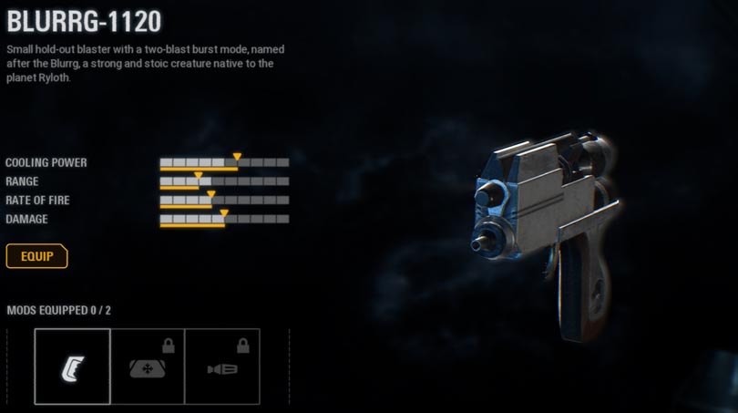 This is a small hold-out blaster with a 2-blast burst mode, named after the Blurrg – a strong and stoic creature native to the planet Ryloth. It’s unlocked after 200 kills and includes the following mods: