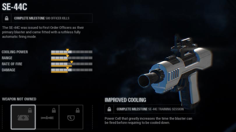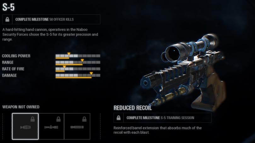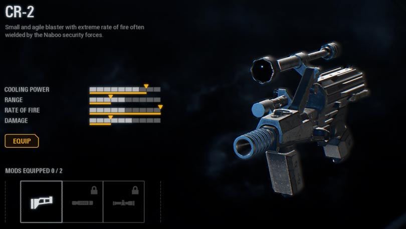 A small and agile blaster with extreme rate of fire often wielded by the Naboo security officers. It can be yours when you defeat 200 enemies on the Battlefront. Its upgrades include: