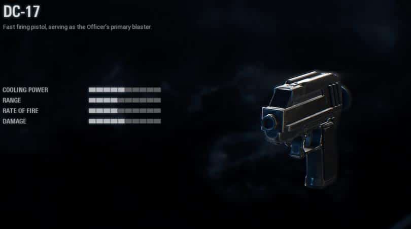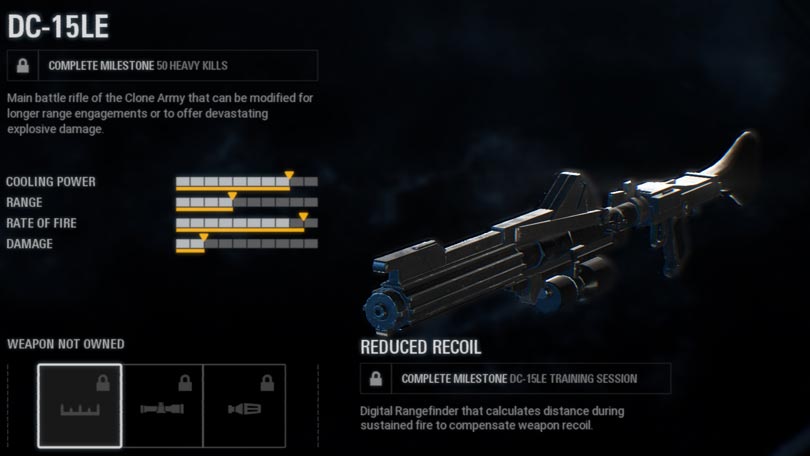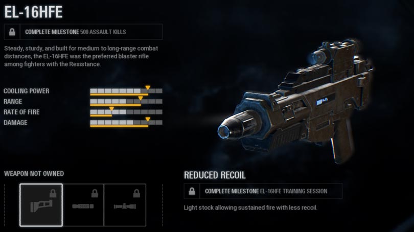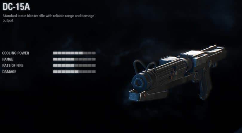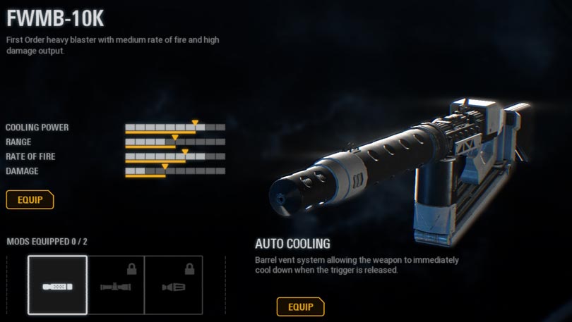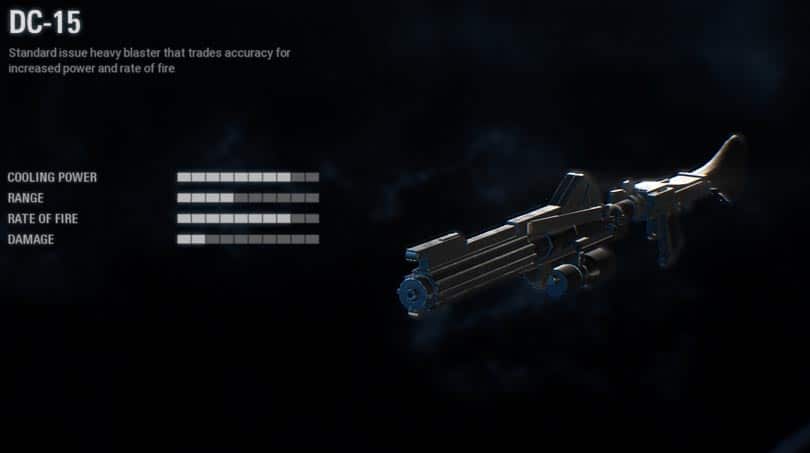 The stock weapon is a balanced standard issue heavy blaster that trades accuracy for increased power and rate of fire. It cannot be upgraded and modified.
