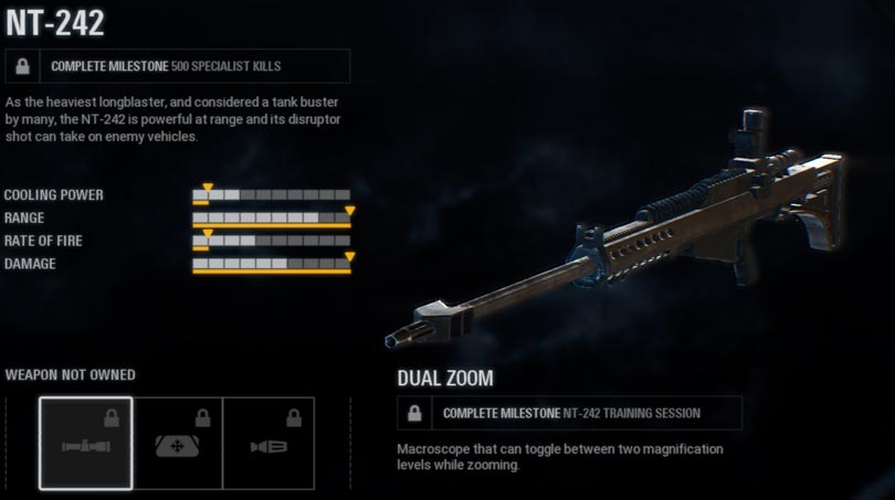 This longblaster is manufactured for high precision and power over long ranges. It is the default weapon for the Specialist class and doesn’t allow any upgrades to be made.