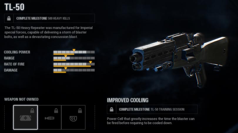 The TL-50 Heavy Repeater is capable of delivering a storm of blaster bolts, as well as a devastating concussion blast. Available after you defeat 500 enemies. It can be upgraded with the following mods: