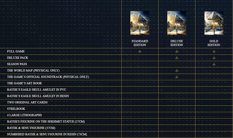 Assassin’s Creed: Origins is being sold in six different packages – Standard Edition, Deluxe Edition, Gold Edition, God’s Edition, Dawn of the Creed Edition, Dawn of the Creed Legendary Edition. In this article we’ll take an in-depth look at the first three, because they are the most popular among the players (I personally got the Gold Edition myself :P).