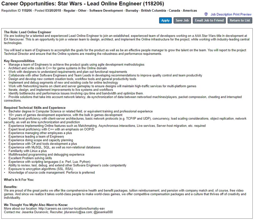 We are looking for a talented and experienced Lead Online Engineer to join an established, experienced team of developers working on a AAA Star Wars title in development at EA Vancouver. This is an opportunity to join a veteran team to design, architect, and implement the Online infrastructure for the project, while working with industry-leading central technologies.