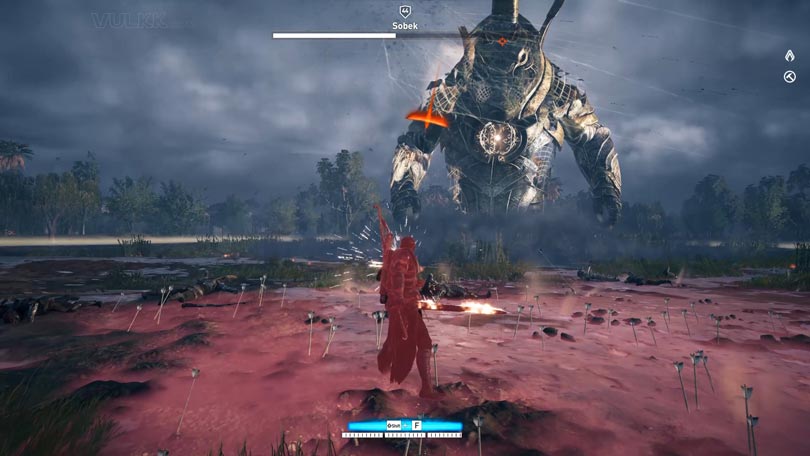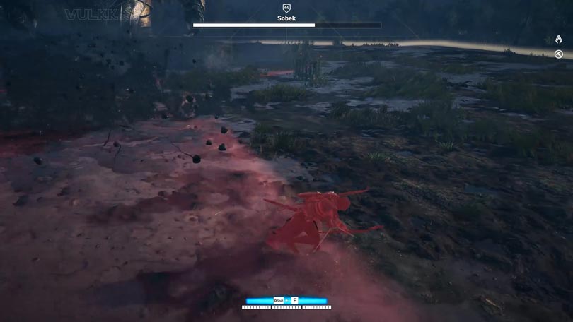 When you see Sobek marking a large portion of the ground with red and the flashing notification “Use Block” – you should either do as the text says – put up your shield in front of you or do your best to run out of the read area as quick as possible. This is Sobek’s final special attack worth mentioning. A rain of arrows will fall down on Bayek, taking small amounts of HP, but hitting him multiple times. Remember to face Sobek while blocking – line of sight is important here.