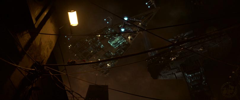 An aerial shot of the Millennium Falcon. Parked, as it seems, “in the slums”? Yes, it does look different. Very!
