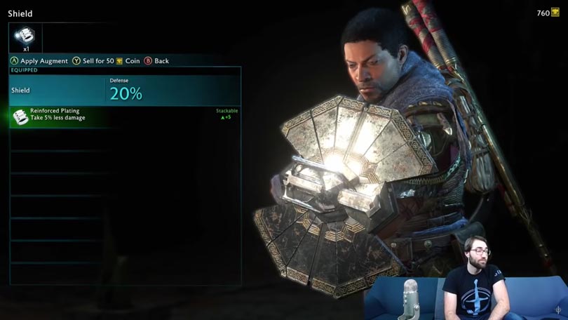 There’s a new segment in Baranor’s equipment – Augments. These special upgrades can be sold for Coins if you don’t need them. Coins are a new In-Game currency related to the Mercenaries in Lithlad. The specific Augment you see on the image below – a Reinforced Plating – will attach to Baranor’s shield and boost his defense by allowing him to take 5% less damage.