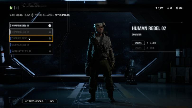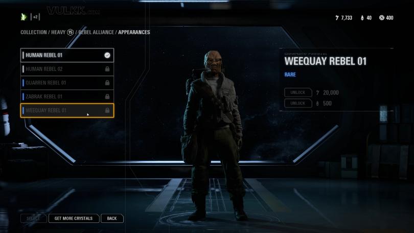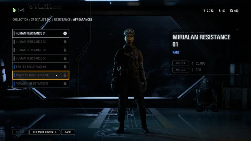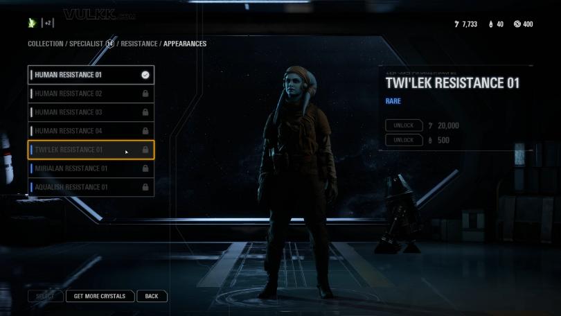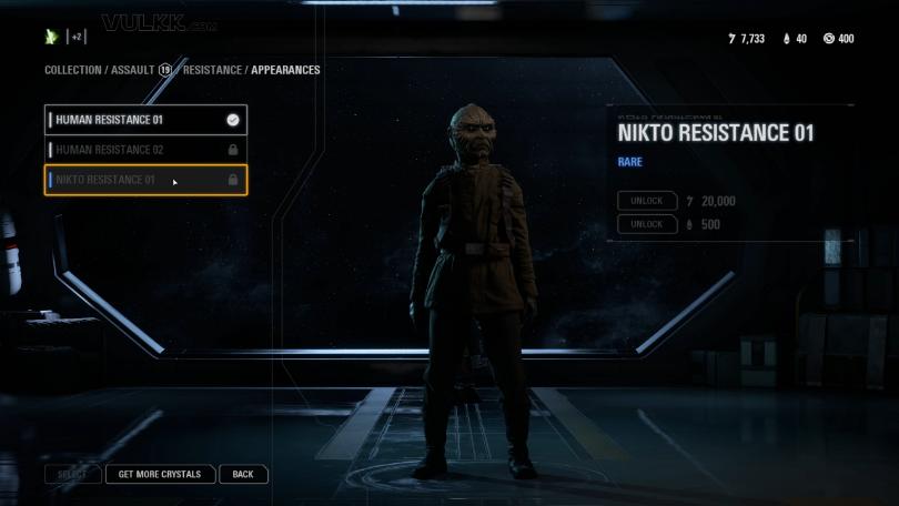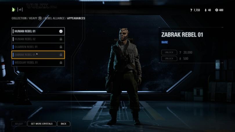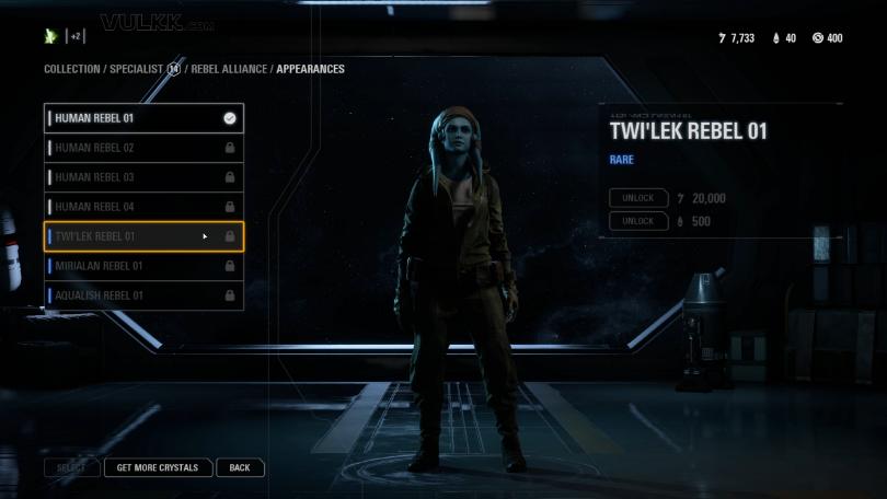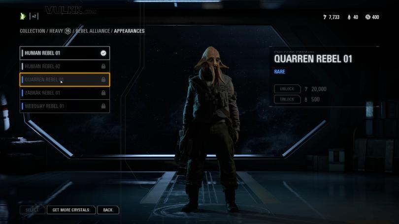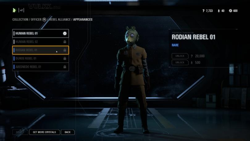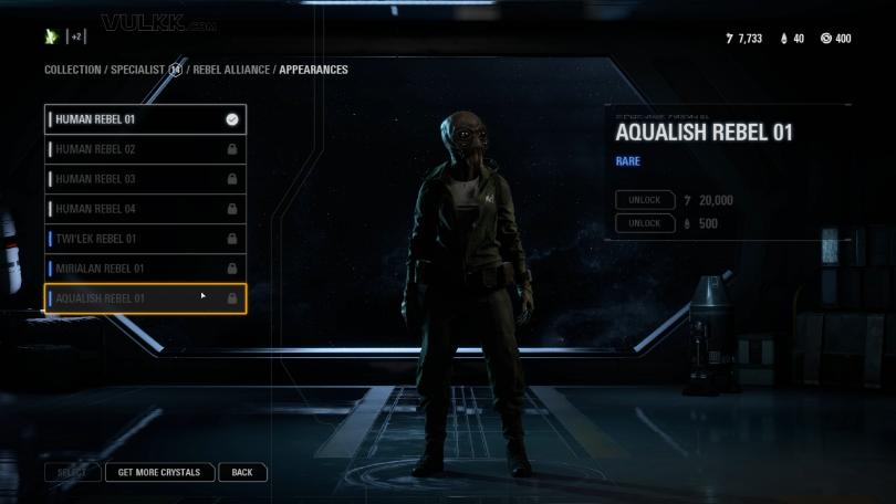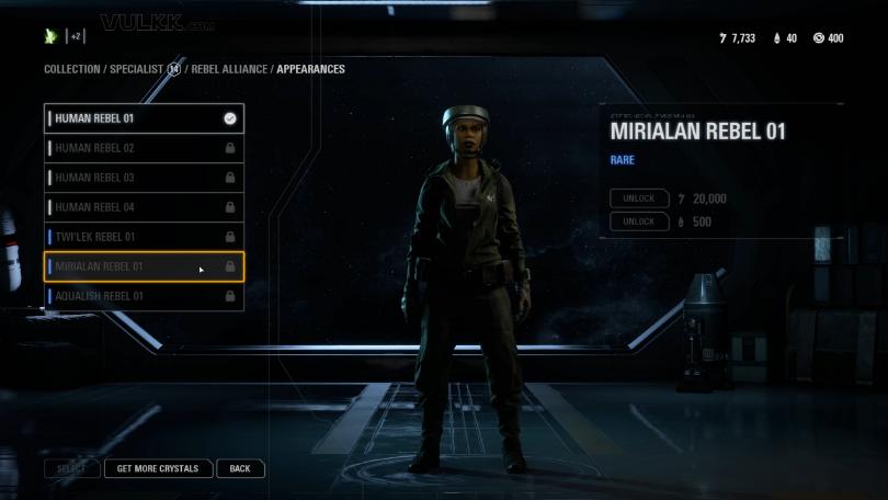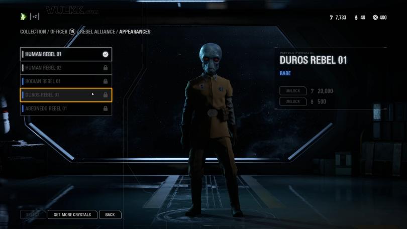 Usually the Human appearances are “common” rarity and cost 5000 Credits or 150 Crystals. The more expensive “Rare” quality are usually the non-human editions of the Troopers. Spanning from Zabrak, through Quarren to Weequay and even Duros, the number of alien species is impressive. All of the Rare skins cost 20 000 Credits to unlock or you get them for 500 Crystals each.