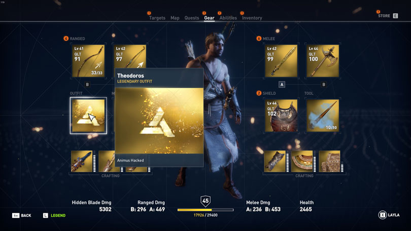 While playing with one of the unique skins from the Hacked Animus Control Panel, you cannot change outfits in the Gear screen. If you switch to Bayek again, the option to use any of the outfits for him is available again.