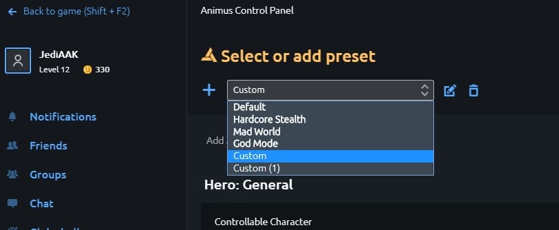 At the very top of the Animus Control Panel there are three default presets for you to choose from: