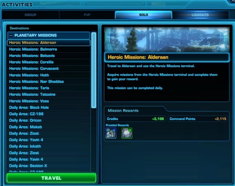 There are a lot of daily missions, which at level cap can be completed in no time. I have detailed guides for SWTOR’s daily areas that will teach you the best approach to each mission and order in which to complete them all to maximize effectiveness and minimize the “walking time”.