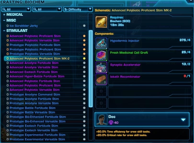 A much more effective, but also dangerous is the next method – crafting various items based on your character(s) crafting professions and gathering skills and then selling them on the Galactic Trade Network (GTN) or directly to other players.