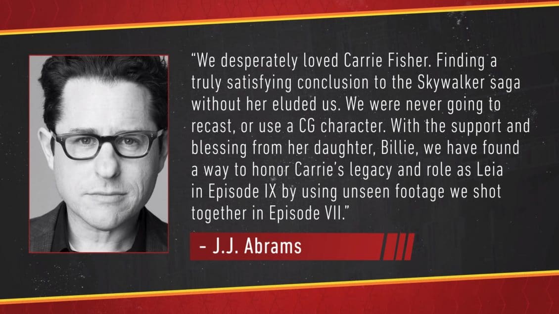 The role of Leia Organa will once again be played by Carrie Fisher, using previously unreleased footage shot for Star Wars: The Force Awakens. “We desperately loved Carrie Fisher,” says Abrams. “Finding a truly satisfying conclusion to the Skywalker saga without her eluded us. We were never going to recast, or use a CG character. With the support and blessing from her daughter, Billie, we have found a way to honor Carrie’s legacy and role as Leia in Episode IX by using unseen footage we shot together in Episode VII.”