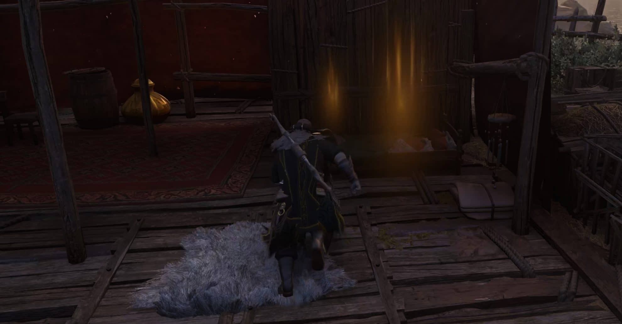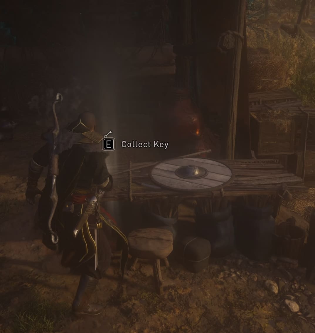 Pick up the key on a table outside and enter the hut. Break the wooden door to reach the two chests. The locked one is the one with the armor piece.