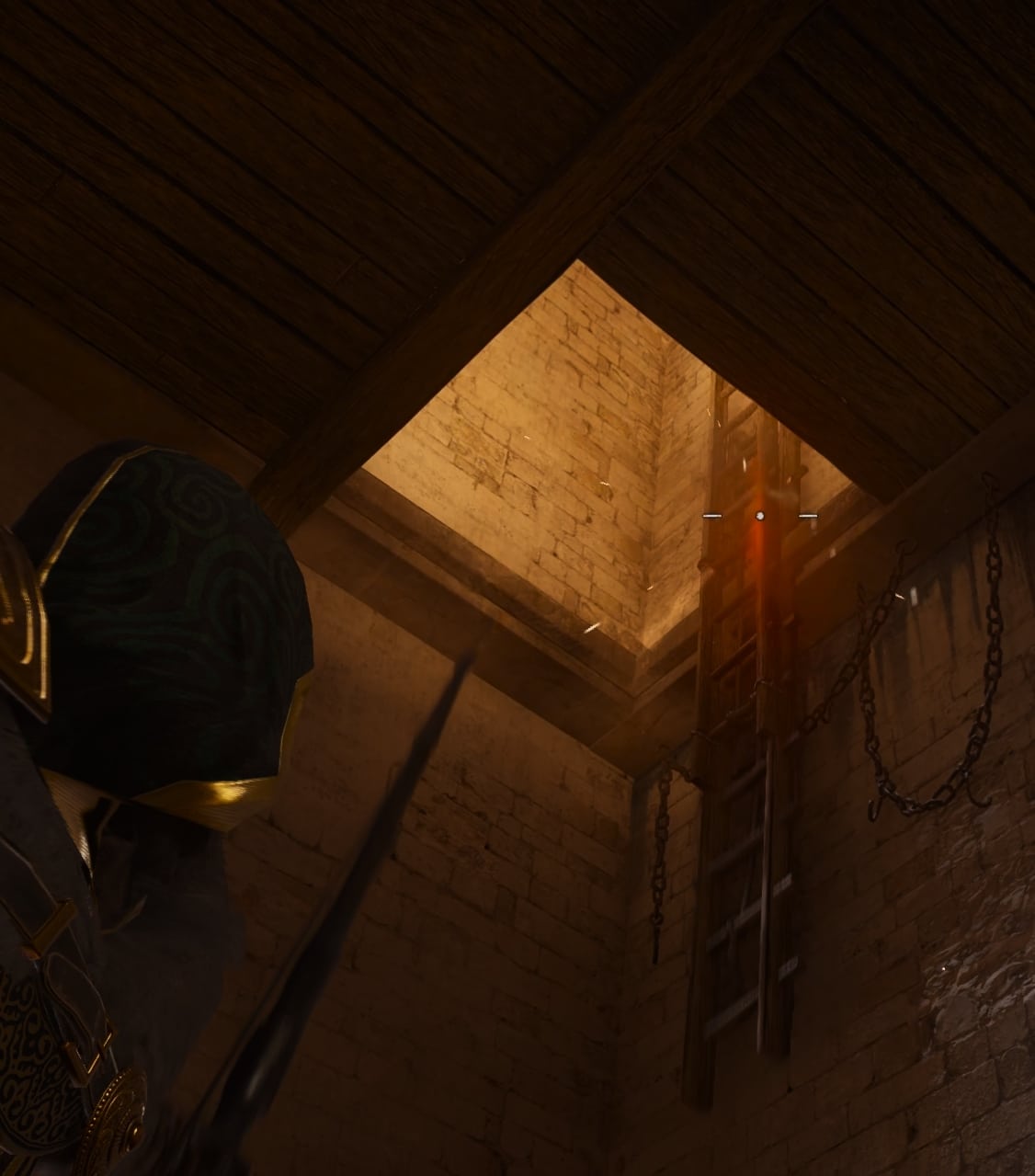 Look up. Shoot an arrow at this weak section of the ceiling to create an opening.