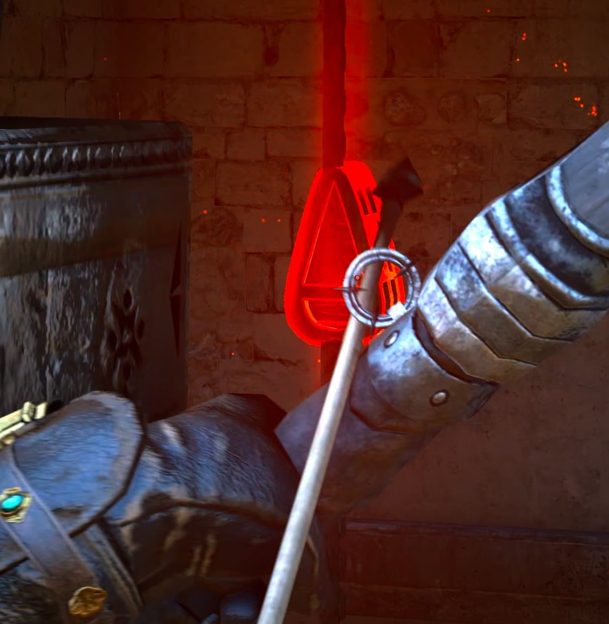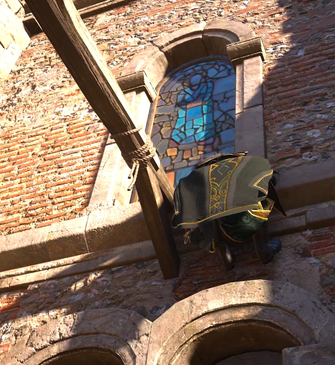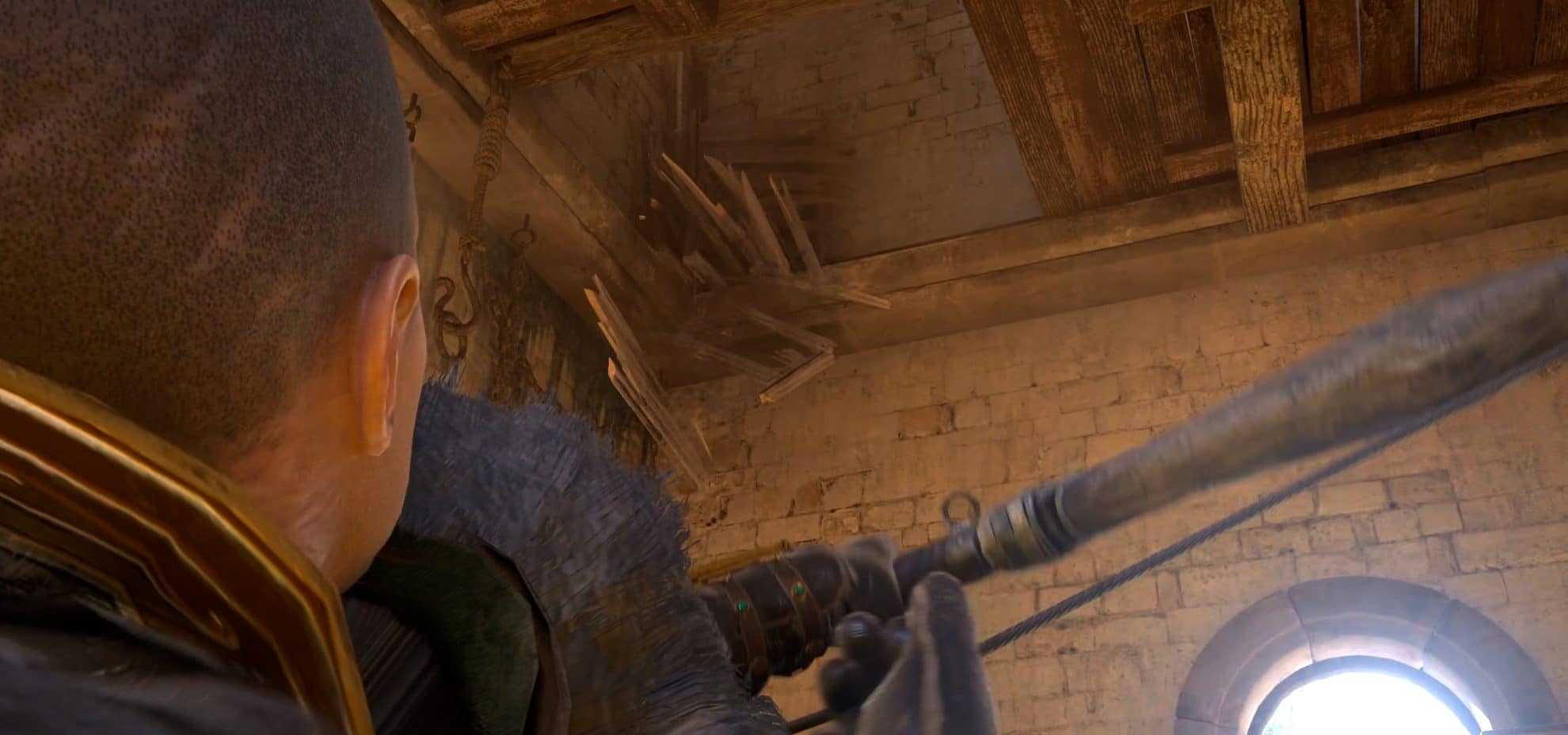 Climb up and break one of the colored-glass windows. Find the weak spot of the hanging weight and shoot it.
