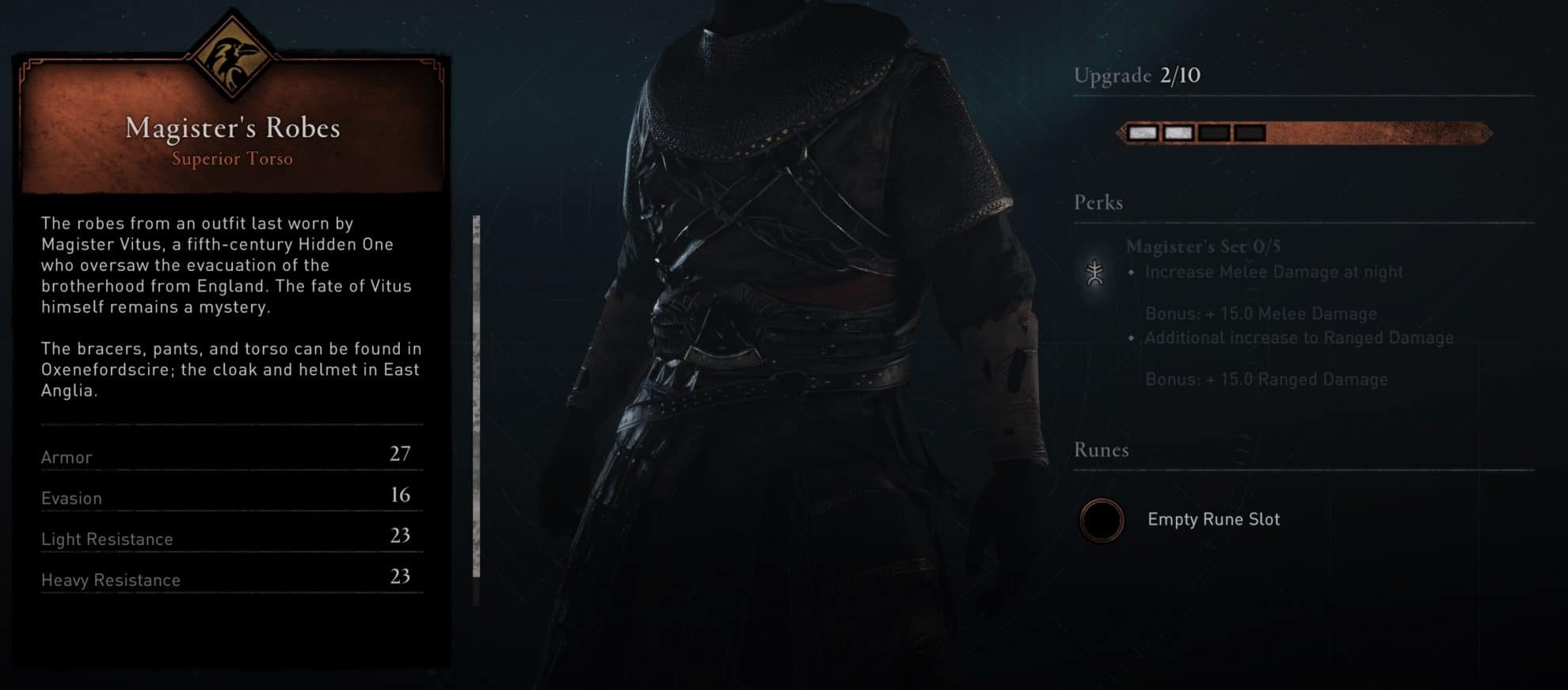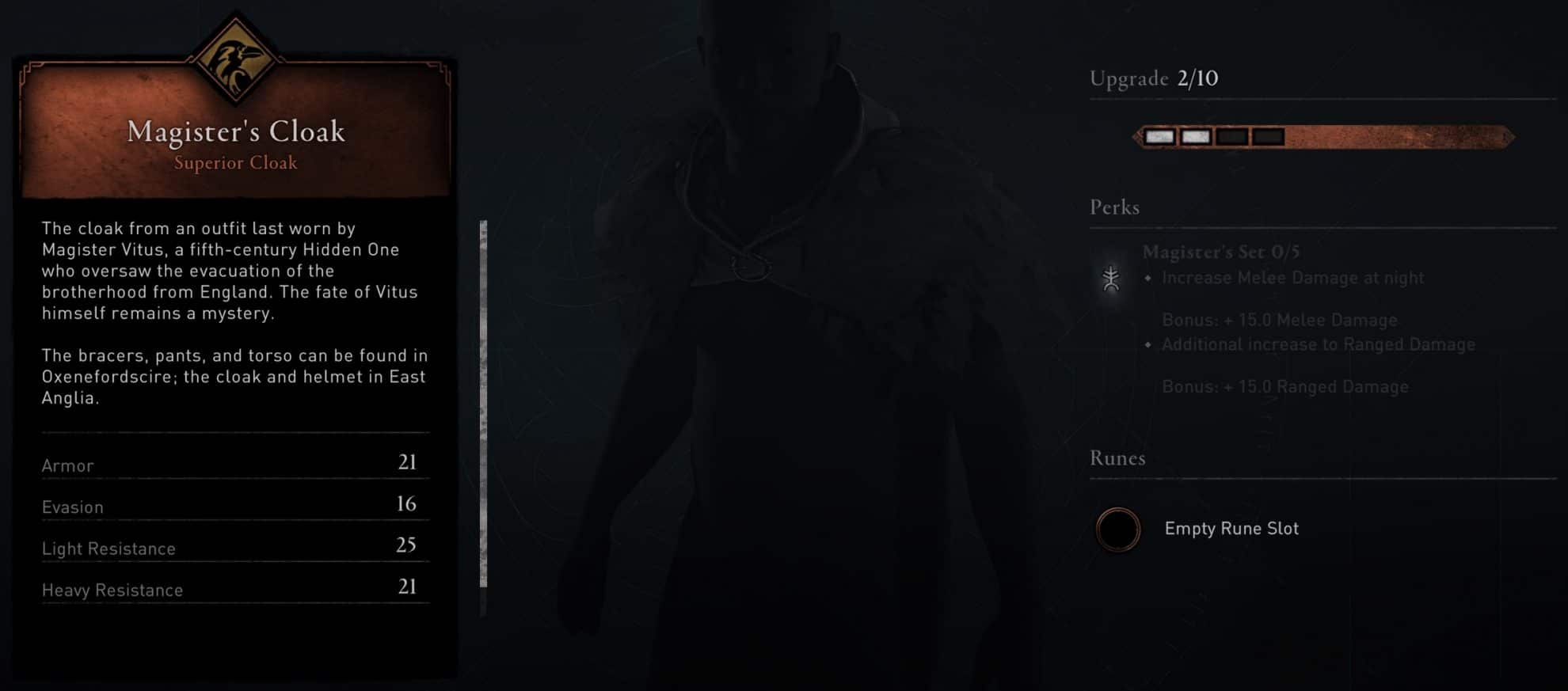 The Magister’s Set is a collection of armor pieces available in Assassin’s Creed Valhalla. It is part of the Raven gear collection (Assassin/Stealth Skill Tree) and any yellow passive increasing Raven gear from your Skill Tree will directly increase the stats of this set.