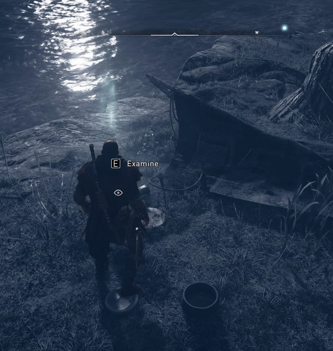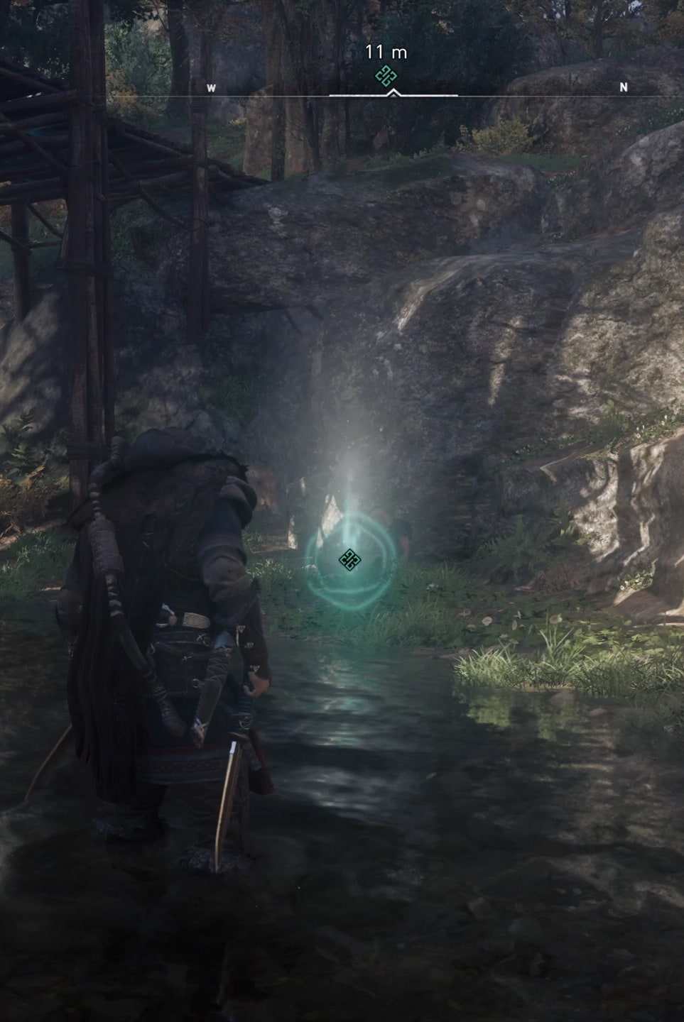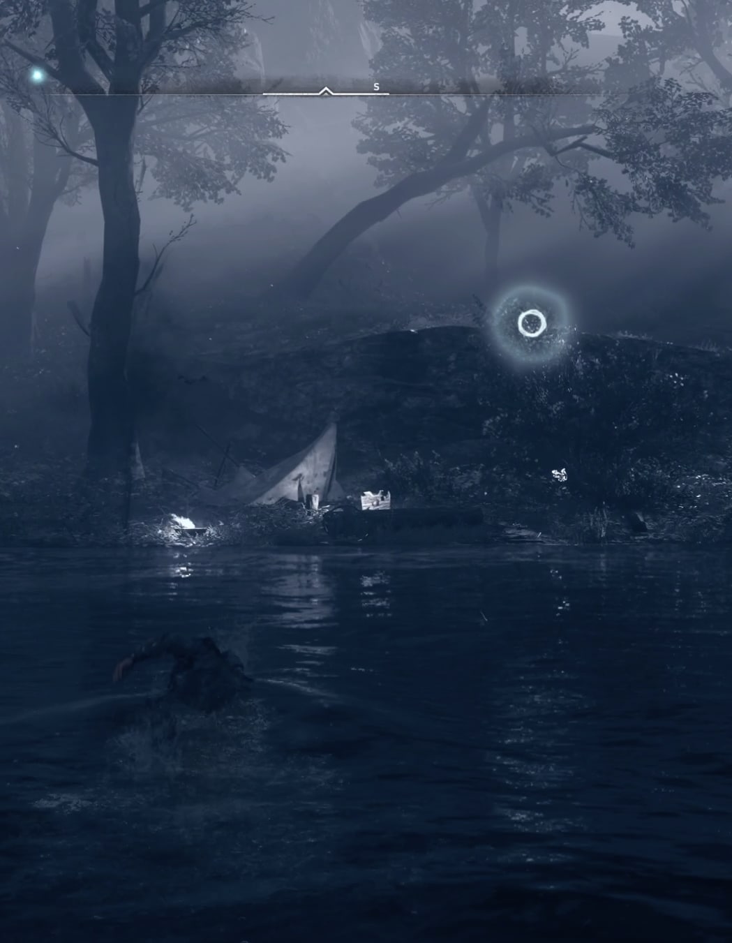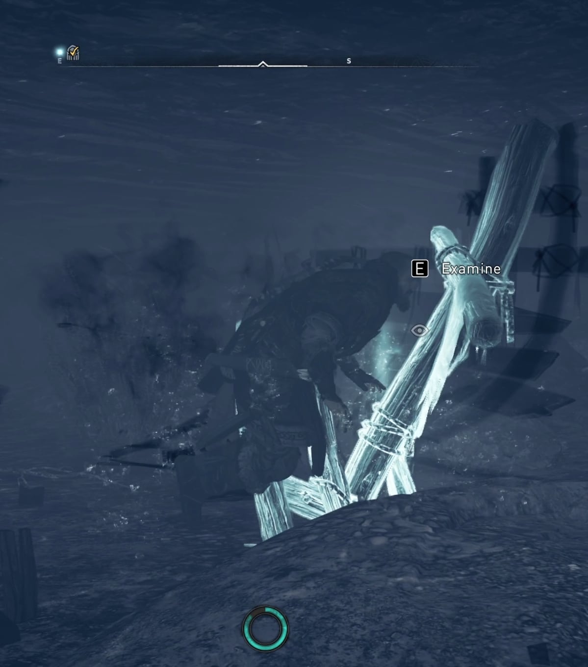 The final fourth item to examine is actually under water. Dive to the depths of the river and use Odin’s Sight to spot what remains of a ship.