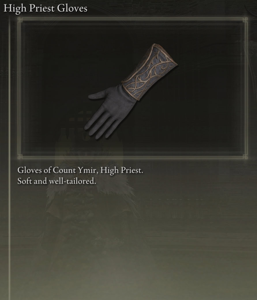 Count Ymir’s garb consists of the High Priest Armor Set, and later the Finger Robe and Maternal Staff.