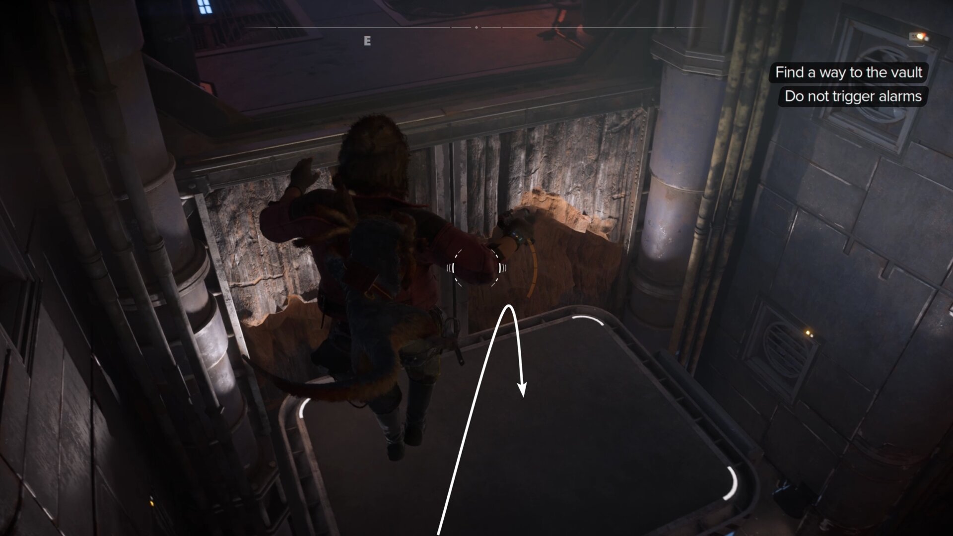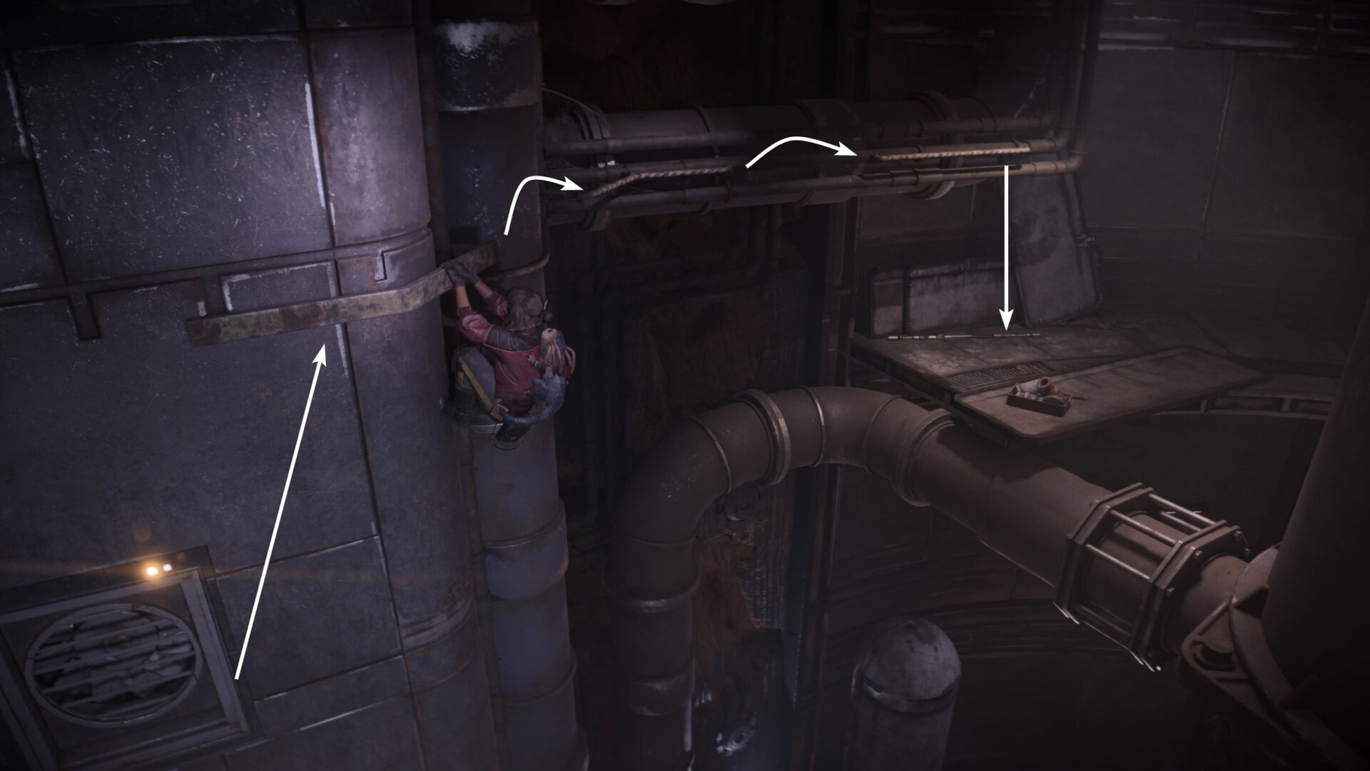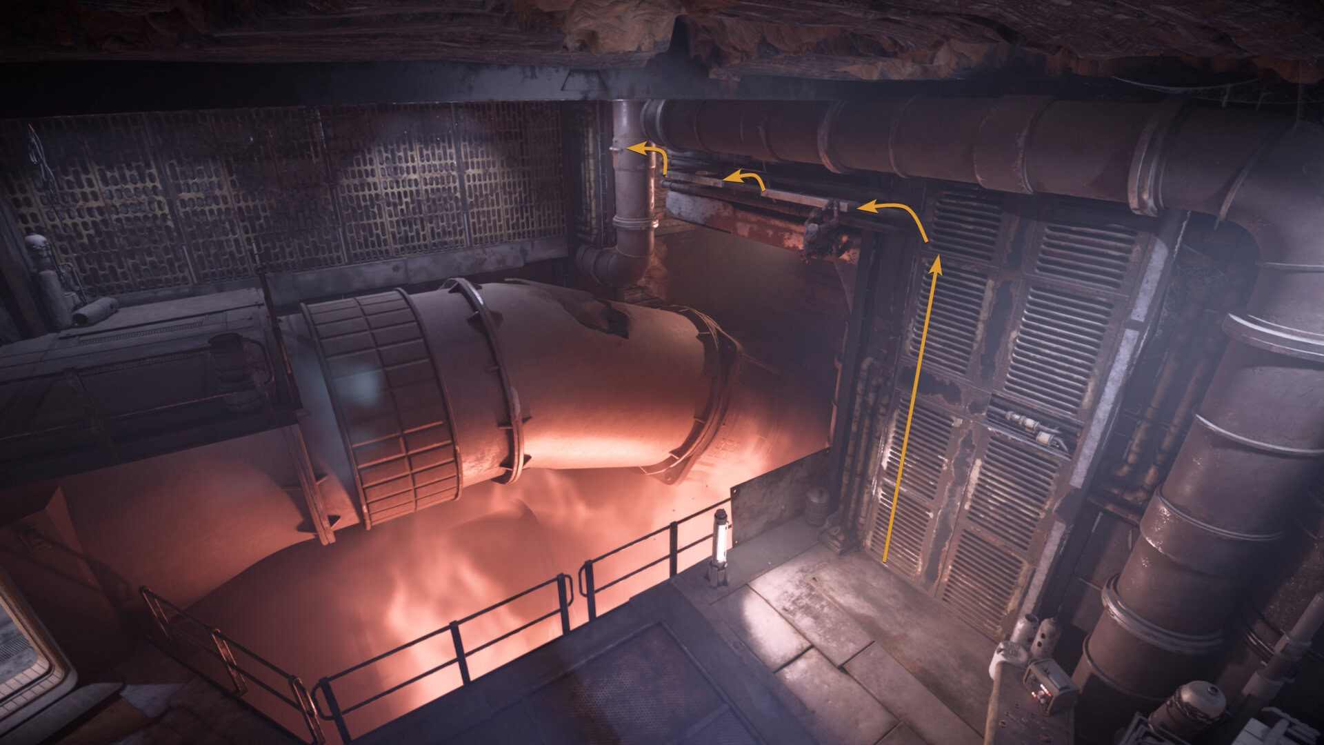 Catch up with Gedeek and Riko to find them stuck at another fan. Climb up the grates to the south and work your way towards the suspended walkway.